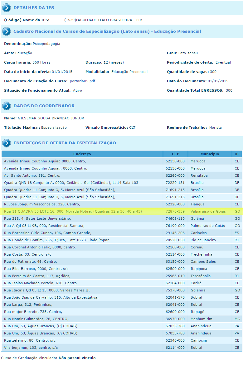 O polo supracitado esta localizado na Rua 11 - Quadra 35 - Lote 16 - Numero 0000 - Morada Nobre (Quadras 32 a 36 - 40 a 43) - Valparaíso de Goiás - GO - CEP 72.870- 339 cedido pela Igreja Assembleia de Deus. A certificadora neste caso é a Faculdade Ítalo Brasileira que esta devidamente reconhecida pelo Ministério da Educação.